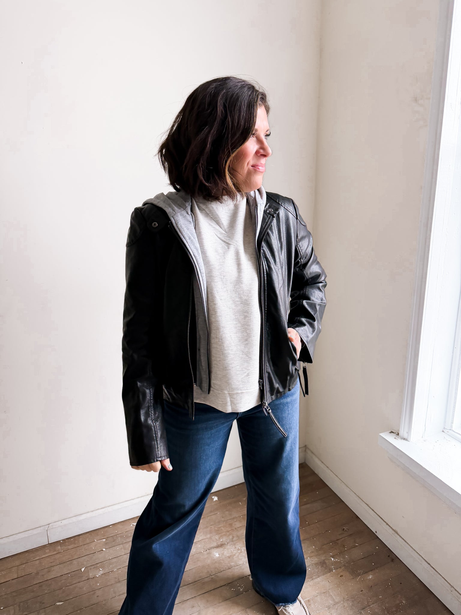 Hooded faux leather moto jacket